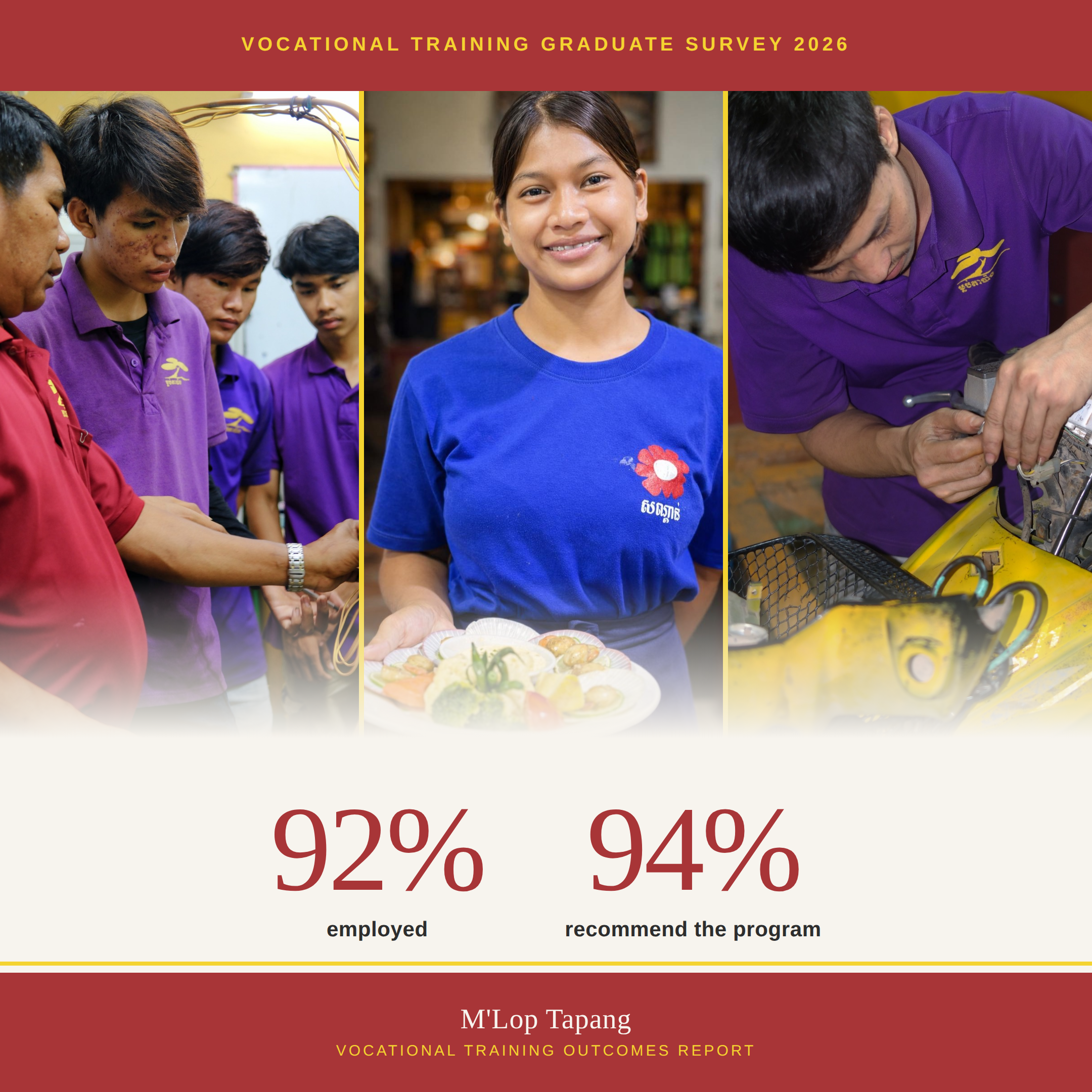 This report presents the findings from the survey of 50 vocational training graduates. The results highlight the program’s strong impact in helping vulnerable youth successfully enter the workforce. At the time of the survey, 92% of graduates were employed, most with job placement support from M’Lop Tapang’s Employment Services Program. Graduates also reported significant income growth, with average monthly earnings increasing from $215 in their first job to $301 as they gained experience, a 40% increase.